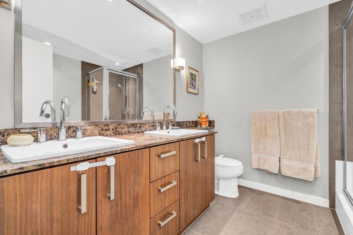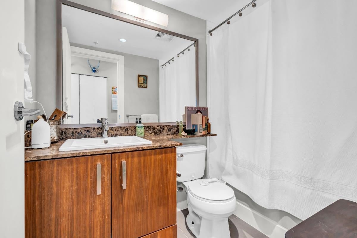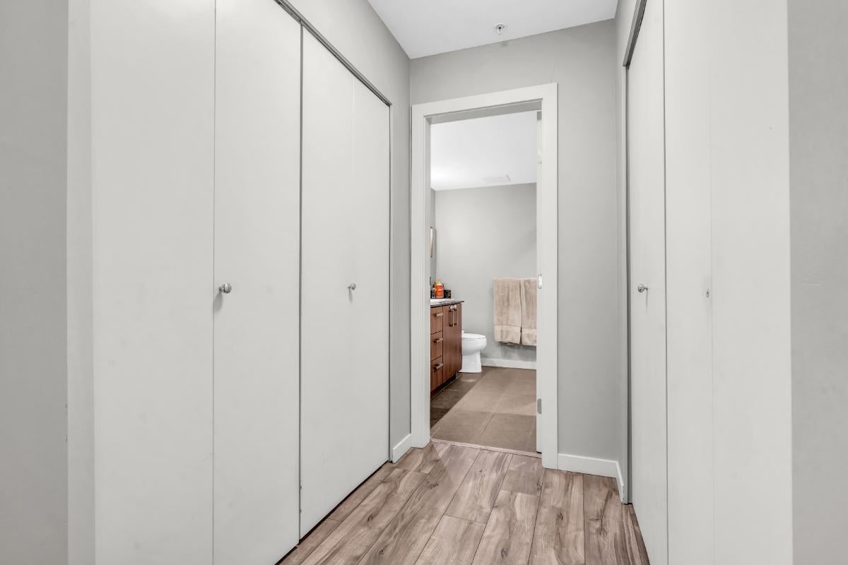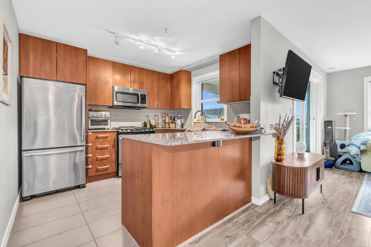The modern kitchen is ideal for cooking and entertaining, with sleek stainless steel appliances, gas cooktop, and ample cabinetry. Just off the living room, enjoy your generous 120 sq. ft. covered balcony—complete with a natural gas hookup for year-round BBQing and relaxing outdoor living.